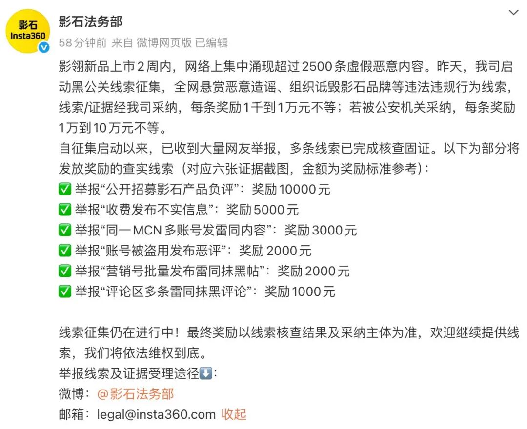 影石创新表示,为打击此类行为,公司启动了黑水军线索公开征集机制,并对有效线索给予现金奖励,征集启动后,影石收到大量网友举报,在对线索初步整理中发现,相关水军行为呈现出多样化的操作方式,例如存在网友账号被盗发布不实评论、部分MCN机构在短时间内集中操控多个账号发帖,甚至存在公开征集黑帖写手、营销号集中分发等行为,具备明显的有偿协作特征。