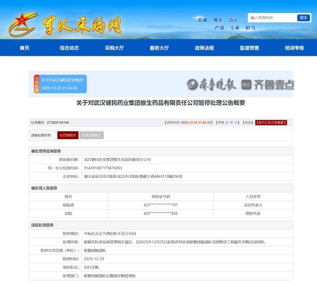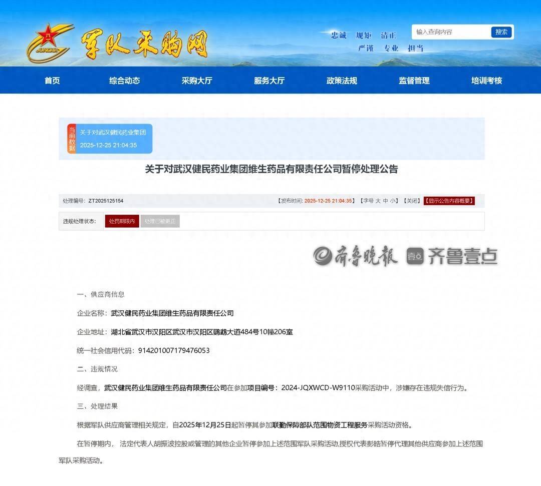 近日,军队采购网发布关于对武汉健民药业集团维生药品有限责任公司暂停处理公告。